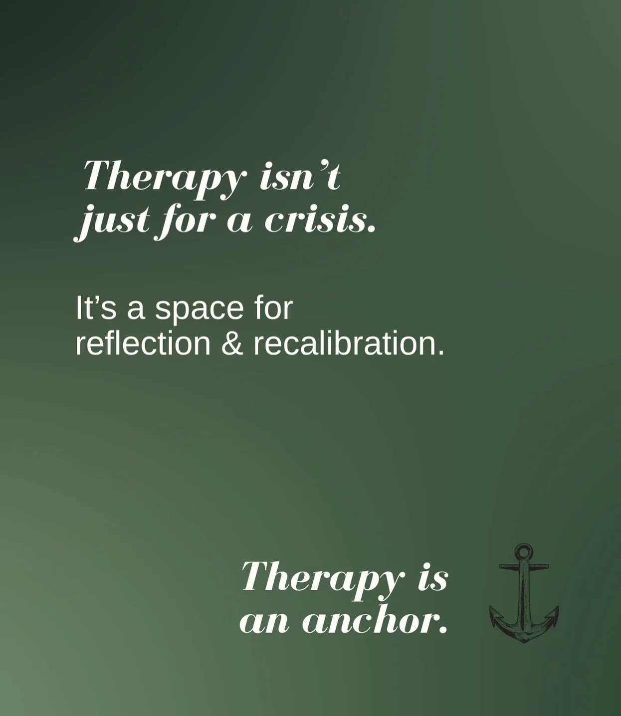 View fullsize Therapy can be a steady place to return — not just in crisis, but consistently.  A space for reflection and recalibration.  Not admonishment.  An anchor.