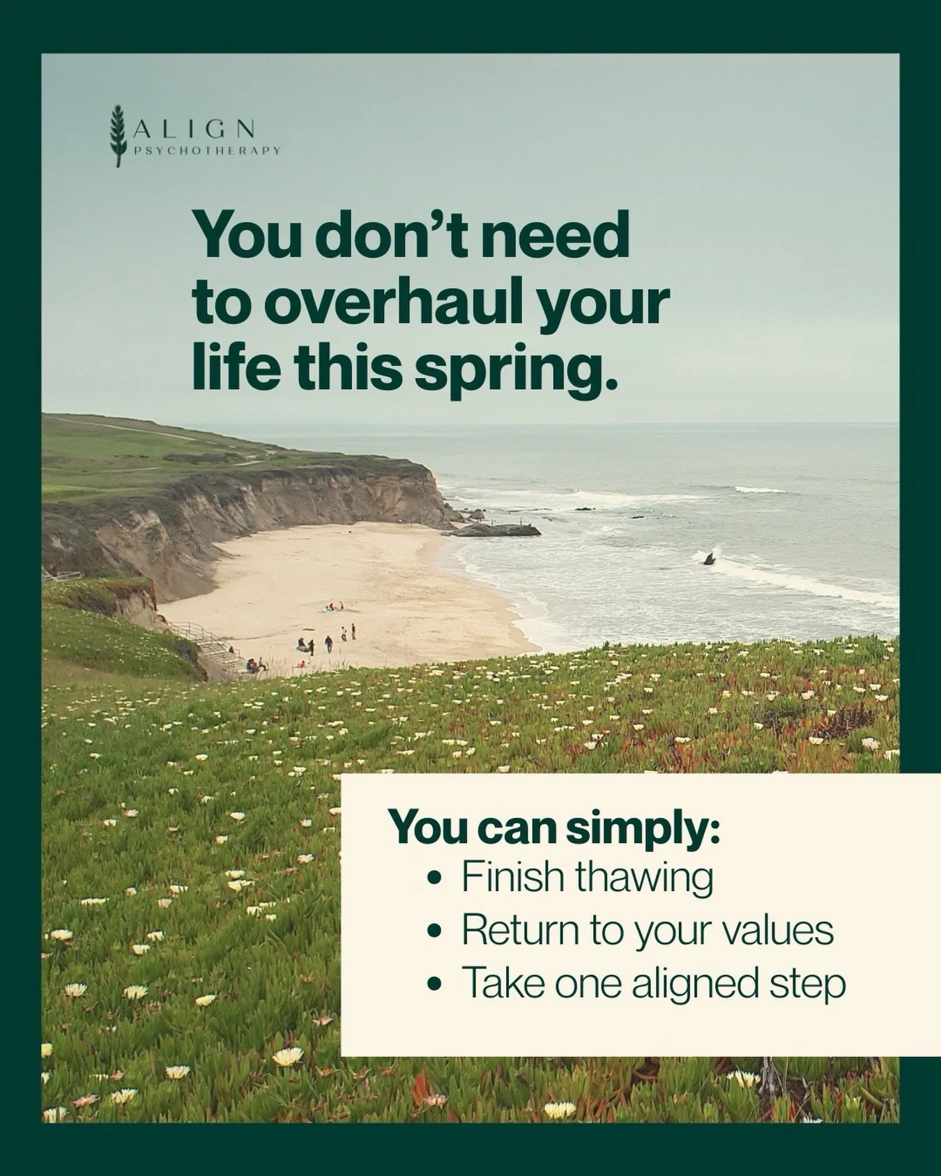View fullsize You don’t need to overhaul your life this spring.  You can simply: • Finish thawing • Return to your values • Take one aligned step If you’re looking for a steady place to return, therapy can help anchor that process. 🌷